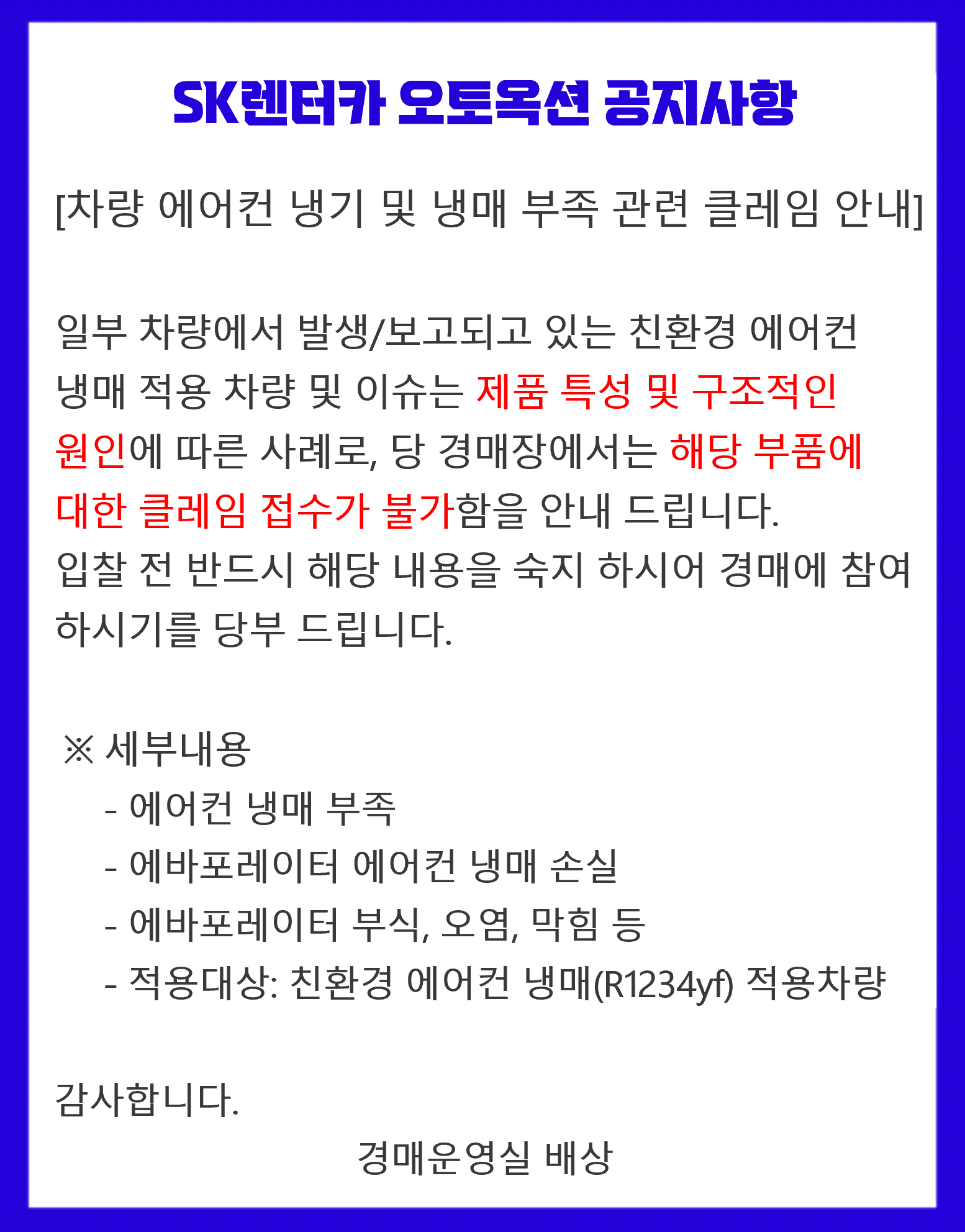 친환경 에어컨 냉매 관련 클레임 접수 불가 안내