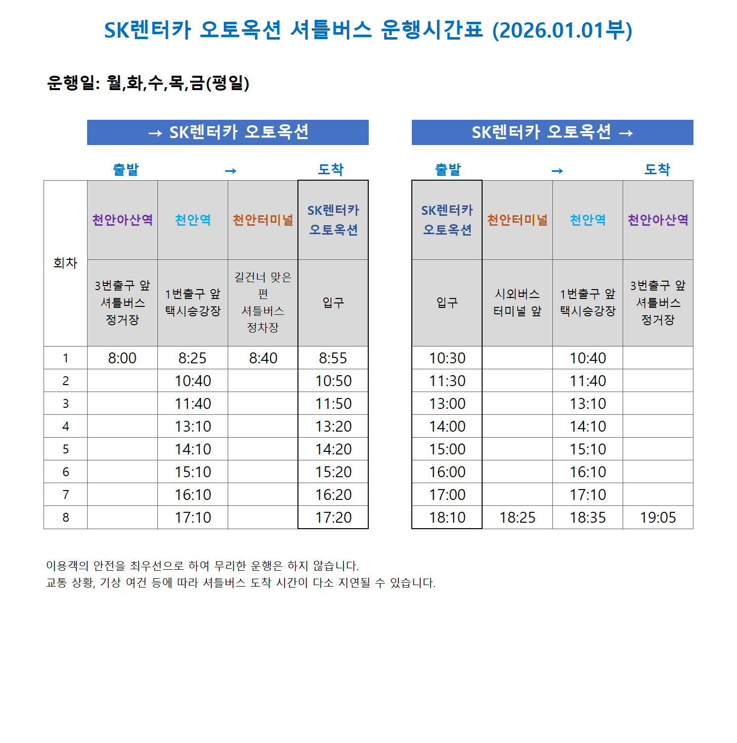 2026년 1월 1일 부터 SAA 셔틀버스 운행 시간 및 기준이 변경됩니다.